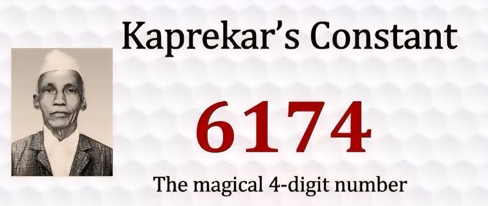 যে কোনো চার অংকের সংখ্যা নিন। কিন্তু শর্ত হলো চারটি ডিজিট যেন সবগুলো একই না হয়। প্রথমে ডিজিটগুলো বড় থেকে ছোট করে সাজিয়ে একটি সংখ্যা লিখুন। তারপর ছোট থেকে বড় করে সাজিয়ে আরেকটি সংখ্যা লিখুন। এবার বড় সংখ্যাটি থেকে ছোট সংখ্যাটি বিয়োগ করুন। যে বিয়োগফল পাবেন, সেটিকে নিয়েই আবার একই পদ্ধতিতে বড় থেকে ছোট, এবং ছোট থেকে বড় করে সাজিয়ে আবার বিয়োগ করুন। এভাবে কয়েক ধাপ চালিয়ে যেতে থাকলে দেখবেন, বিয়োগফল এসে দাঁড়াবে ৬১৭৪-তে। আর একবার ৬১৭৪-তে পৌঁছালে এরপর আর সেটা বদলাবে না।