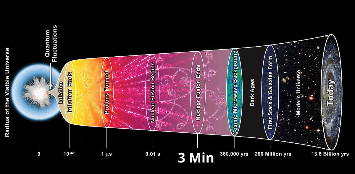 বিজ্ঞানীরা মনে করেন এখন থেকে ১৩.৭ বিলিয়ন বছর আগে এক মহাবিস্ফোরণ বা বিগ ব্যাং এর ফলে মহাবিশ্বের সূচনা হয়েছিল। বিজ্ঞানীরা বলেন, এই মহাবিস্ফোরণের পর প্রথম তিনটি মিনিট ছিল খুবই গুরুত্বপূর্ণ। তাদের ধারণা, মহাবিশ্বের যাবতীয় প্রাথমিক বস্তুকণা এই প্রথম তিন মিনিটের মধ্যেই সৃষ্টি হয়েছিল। মহাবিস্ফোরণের শক্তি থেকে প্রাথমিক বস্তুকণার রূপান্তর কিভাবে হয়েছিল তার ব্যাখ্যা তাত্ত্বিক পদার্থ বিজ্ঞানীরা দিয়েছেন। তারা বলেন, মহাবিস্ফোরণের ফলে অতি উচ্চ তাপমাত্রায় প্রচন্ড শক্তি নির্গত হয়। ট্রিলিয়ন ডিগ্রি তাপমাত্রার এই মহাশক্তি থেকে খুব দ্রুতই কিছু প্রাথমিক বস্তুকণার উদ্ভব হয় যা প্রথম তিন মিনিটের মধ্যেই কয়েক ধাপে হাইড্রোজেন এবং হিলিয়াম পরমাণুতে রূপান্তরিত হয়েছিল। এর পরপরই মহাবিশ্বের প্রসারণ শুরু হয়, যা এখনো ক্রমেই প্রসারিত হয়েই চলেছে। পরবর্তীতে হাইড্রোজেন এবং হিলিয়াম পরমাণু মহাকর্ষের ফলে পুঞ্জীভূত হয়ে বিভিন্ন নক্ষত্র, নেবুলা এবং গ্যালাক্সির জন্ম দেয়, যা এখন আমাদের পরিচিত মহাবিশ্বের অংশ।