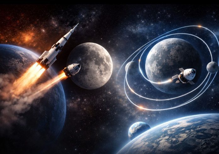 অ্যাপোলো আর আর্টেমিসের মধ্যে পার্থক্যটা তাই শুধু সময়ের নয়, পথেরও। অ্যাপোলোর ছিল ছোট ও সরাসরি পথের দ্রুত যাত্রা। আর্টেমিস বেছে নিয়েছে বড়, হিসেবি আর নিরাপদ পথ। আরেকটি গুরুত্বপূর্ণ বিষয় হলো ট্র্যাজেক্টরি বা গতিপথের নকশা। অ্যাপোলো মিশনেই প্রথম “ফ্রি-রিটার্ন ট্র্যাজেক্টরি” ব্যবহার করা হয়েছিল। একটি এমন পথ, যেখানে মহাকাশযান চাঁদের পাশ দিয়ে ঘুরে মহাকর্ষের প্রভাবে স্বাভাবিকভাবেই আবার পৃথিবীর দিকে ফিরে আসে। মাঝপথে বড় কোনো সমস্যা হলে আলাদা করে ইঞ্জিন চালানো ছাড়াই নিরাপদে ফিরে আসার সুযোগ থাকে। আর্টেমিস মিশনেও এই একই মৌলিক ধারণাকে আরও উন্নতভাবে ব্যবহার করা হচ্ছে। সব মিলিয়ে দেখা যায়, অ্যাপোলো তুলনামূলকভাবে দ্রুত চাঁদে পৌঁছালেও, সেটি ছিল একটি সরাসরি ও ঝুঁকিপূর্ণ পথ। আর্টেমিস ধীরগতির মনে হলেও, এটি আসলে আরও পরিণত, পরীক্ষিত এবং নিরাপদ এক কৌশলের প্রতিফলন।