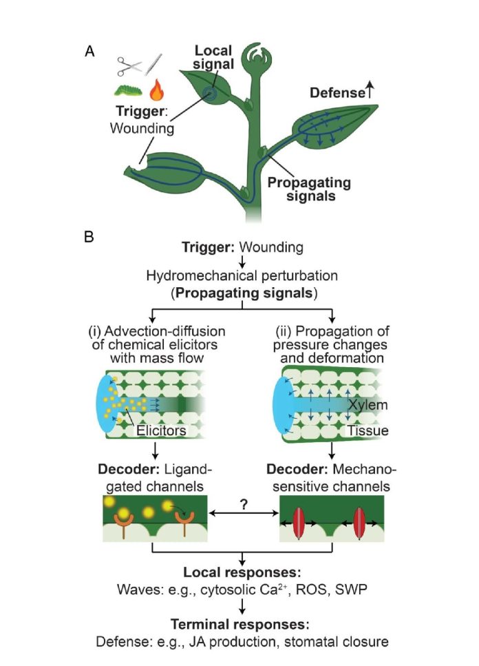 এই গবেষণায় দেখা গেছে, গাছের ভেতরে রয়েছে এক জটিল বার্তাবাহক ব্যবস্থা, যা মূলত কাজ করে ভাস্কুলার সিস্টেমে (জাইলেম ও ফ্লোয়েম) বিদ্যমান নেগেটিভ প্রেসার বা টেনশনের মাধ্যমে। এই ভাস্কুলার সিস্টেম শুধু পানি ও পুষ্টি পরিবহণের কাজই করে না, এটি সংকেত পরিবহণেও গুরুত্বপূর্ণ ভূমিকা রাখে। যখন গাছ কোনো ধরনের স্ট্রেসের মুখে পড়ে, যেমন জলস্বল্পতা, অতিরিক্ত গরম বা পোকামাকড়ের আক্রমণ, তখন জাইলেম টিস্যুতে পানির টান বা প্রেসারে আকস্মিক পরিবর্তন ঘটে। এই পরিবর্তন পুরো গাছজুড়ে একটি সংকেতের ঢেউ তৈরি করে। একই সময়ে নির্গত হয় কিছু রাসায়নিক পদার্থ, যেমন জ্যাসমোনিক অ্যাসিড, যা গাছের প্রতিরক্ষা ব্যবস্থাকে সক্রিয় করে তোলে। আক্রান্ত পাতার রাসায়নিক বার্তা পানির সঙ্গে মিশে ছড়িয়ে পড়ে অন্য পাতায়, ডালপালায়, এমনকি শেকড় পর্যন্ত। তখন গাছের বাকি অংশগুলো সতর্ক হয়ে যায় এবং প্রতিক্রিয়া জানাতে শুরু করে। তবে প্রাণীর স্নায়ুতন্ত্রের মত এটা কোনো বৈদ্যুতিক সংকেত নয়। এটা একটি অভিনব মেকানিক্যাল বার্তাবাহক ব্যবস্থা, যেখানে পানি, প্রেসার, ও রাসায়নিক সংকেত সব মিলে তৈরি হয় এক সজীব তথ্যপ্রবাহ। বিজ্ঞানীরা এই সিস্টেমকে এখন আরও গভীরভাবে বুঝতে পারছেন।
