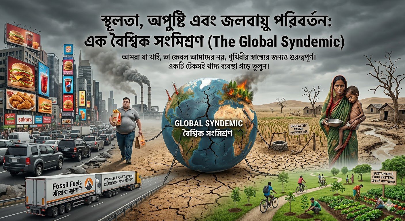 বর্তমান বিশ্বে মানবজাতি এবং আমাদের এই পৃথিবী এক নজিরবিহীন সংকটের মুখোমুখি। আমরা এমন একটি যুগে বাস করছি যেখানে একই সাথে মানুষ না খেয়ে মারা যাচ্ছে, আবার অতিরিক্ত খেয়েও অসুস্থ হচ্ছে। এর পাশাপাশি পরিবেশের ভারসাম্য এমনভাবে নষ্ট হচ্ছে যা আমাদের অস্তিত্বকেই হুমকির মুখে ফেলে দিচ্ছে। বিজ্ঞানীরা স্থূলতা, অপুষ্টি এবং জলবায়ু পরিবর্তন—এই তিনটি বড় সমস্যাকে একসাথে মিলিয়ে একটি নতুন নাম দিয়েছেন ‘সিনডেমিক’ বা বৈশ্বিক সংমিশ্রণ। গবেষকদের মতে, এই তিনটি সমস্যা কোনো বিচ্ছিন্ন ঘটনা নয়; বরং এরা একই সুতোয় গাঁথা এবং একে অপরের প্রভাবকে আরও ভয়াবহ করে তোলে।